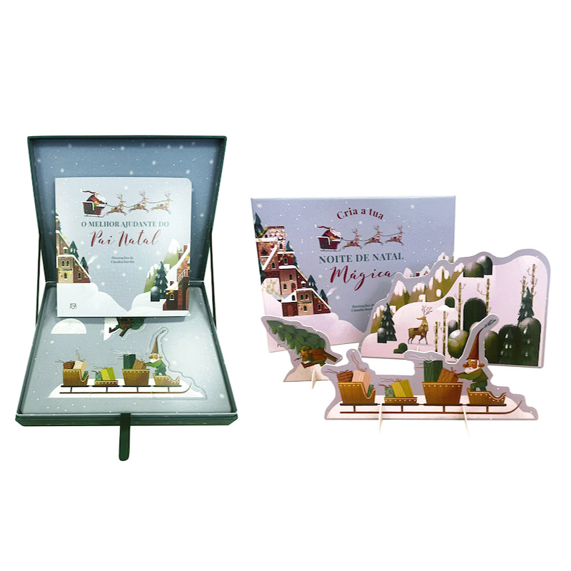 Um livro ilustrado com a história do pequeno duende que é O Melhor Ajudante do Pai Natal, e 15 placas com personagens e elementos para montar o cenário mágico da aldeia do Pai Natal e recriar a história narrada no livro.