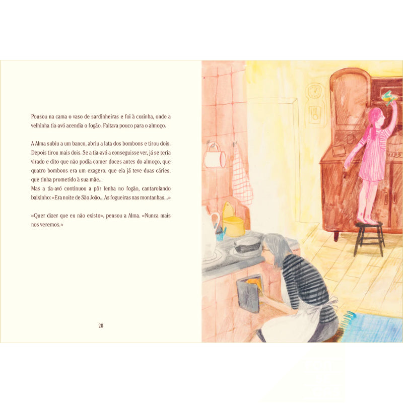 Quando chega o Verão, vai visitar uma tia-avó que vive no campo, perto do mar. Passa os dias a passear e a brincar com o gato. Até que, um dia, ouve vozes e música vindas de um funeral. «Adeus, querida Alma! Brilharás para sempre na nossa memória.» «Mas a Alma sou eu», pensou ela. E, nesse preciso momento, tornou-se invisível.