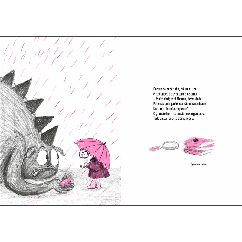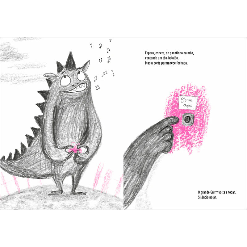 Apresentamos o Grrrrr, estafeta veloz, profissional e encantador. Esta manhã vai entregar um pacotinho, embrulhado com lacinho. Toca à campainha com delicadeza, mas não o ouviram de certeza. Insiste com educação. Quantas vezes? Ninguém responde. E o grande Grrrrr à espera, à chuva e a perder a paciência...