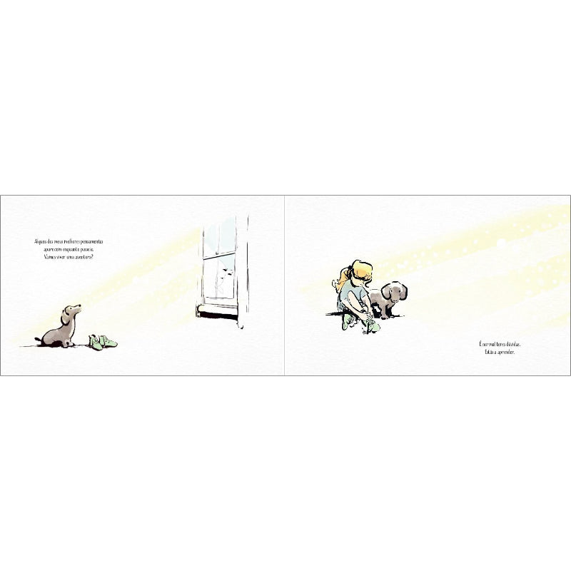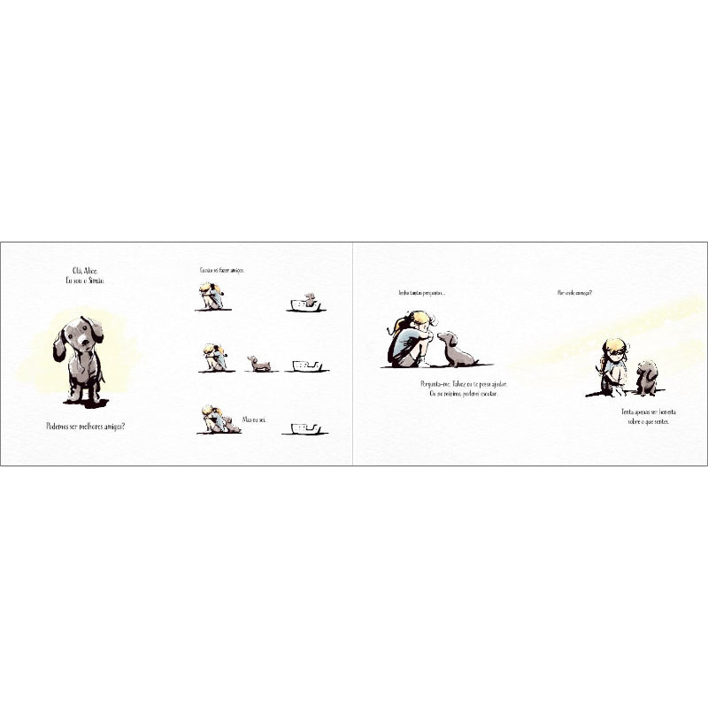 O Simão é um cão com muita sabedoria e um grande coração. A Alice é uma menina receosa de tudo, que gosta que lhe deem a mão.