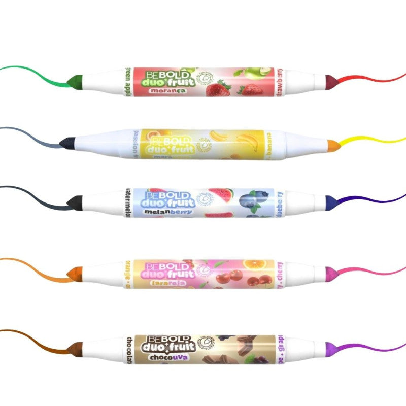 Chegaram os Marcadores BeBold Duo Fruit. O marcador perfumado da Newpen que reúne duas pontas de diferentes cores, num só marcador e permite traços finos e grossos, devido à sua ponta cónica.